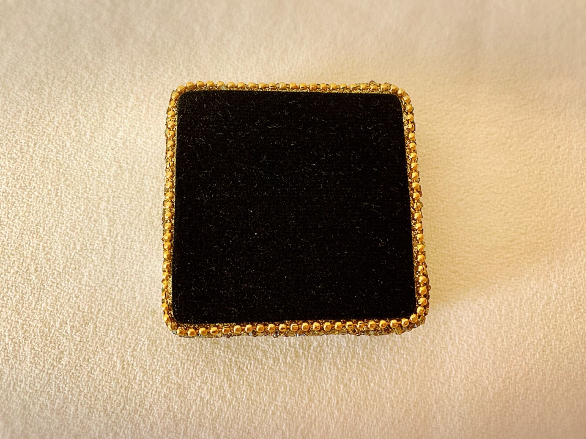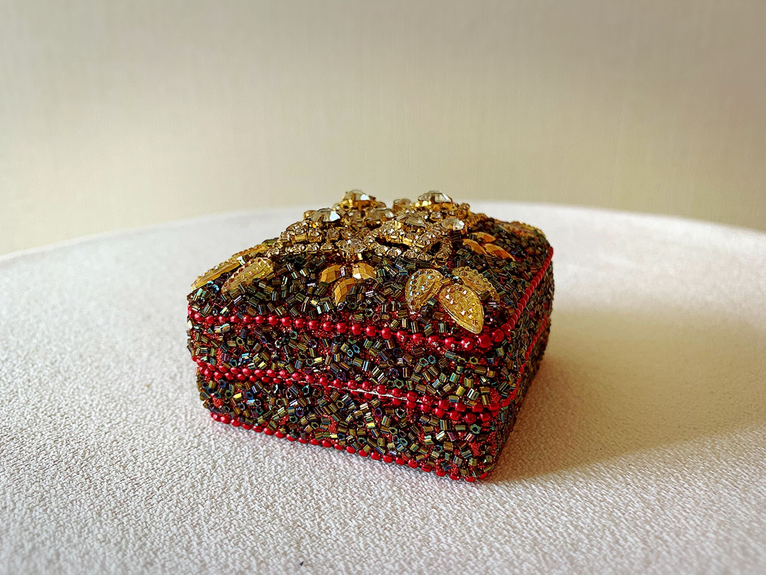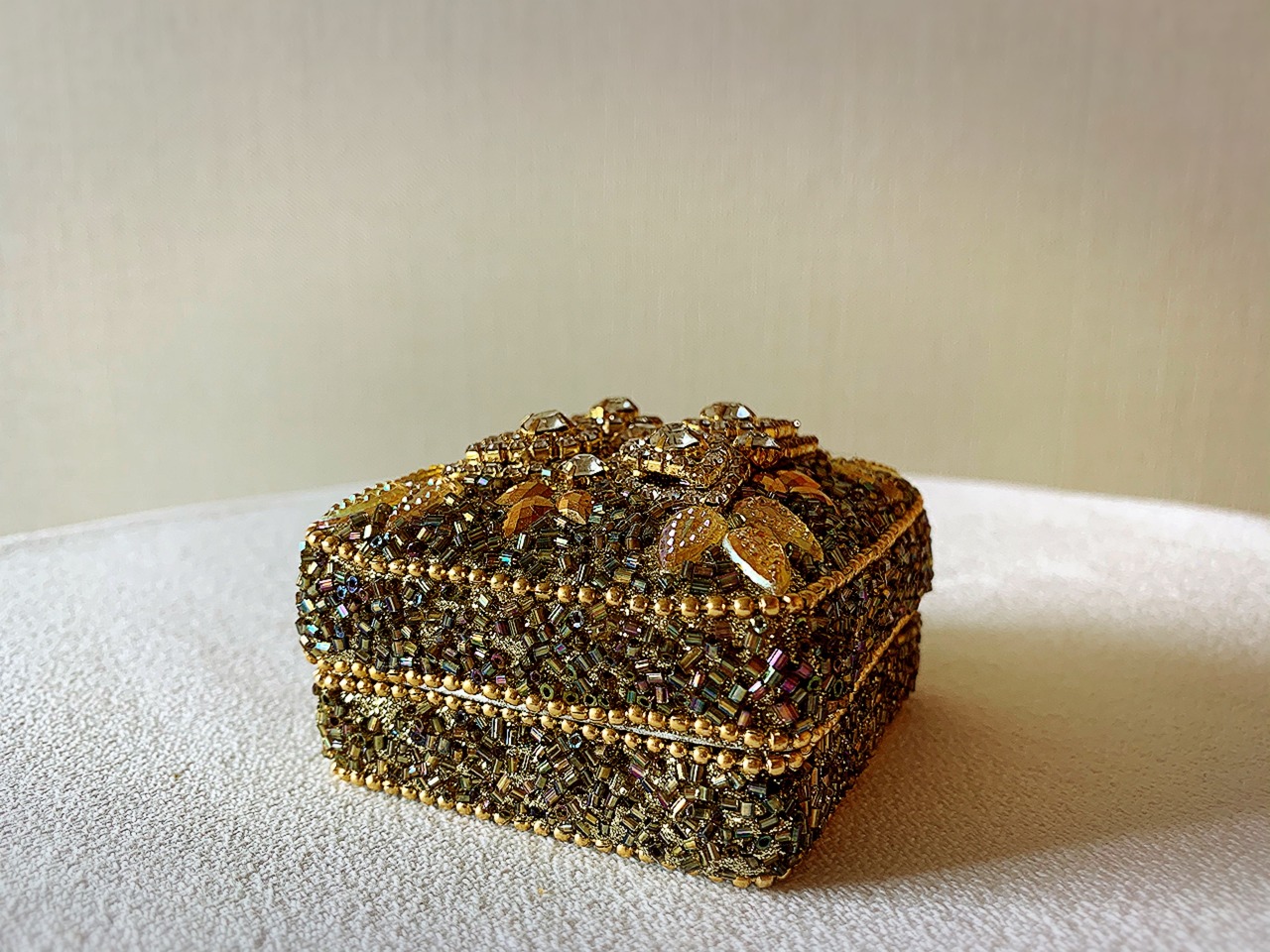 正方形のキラキラしたビーズをあしらった小物入れです。