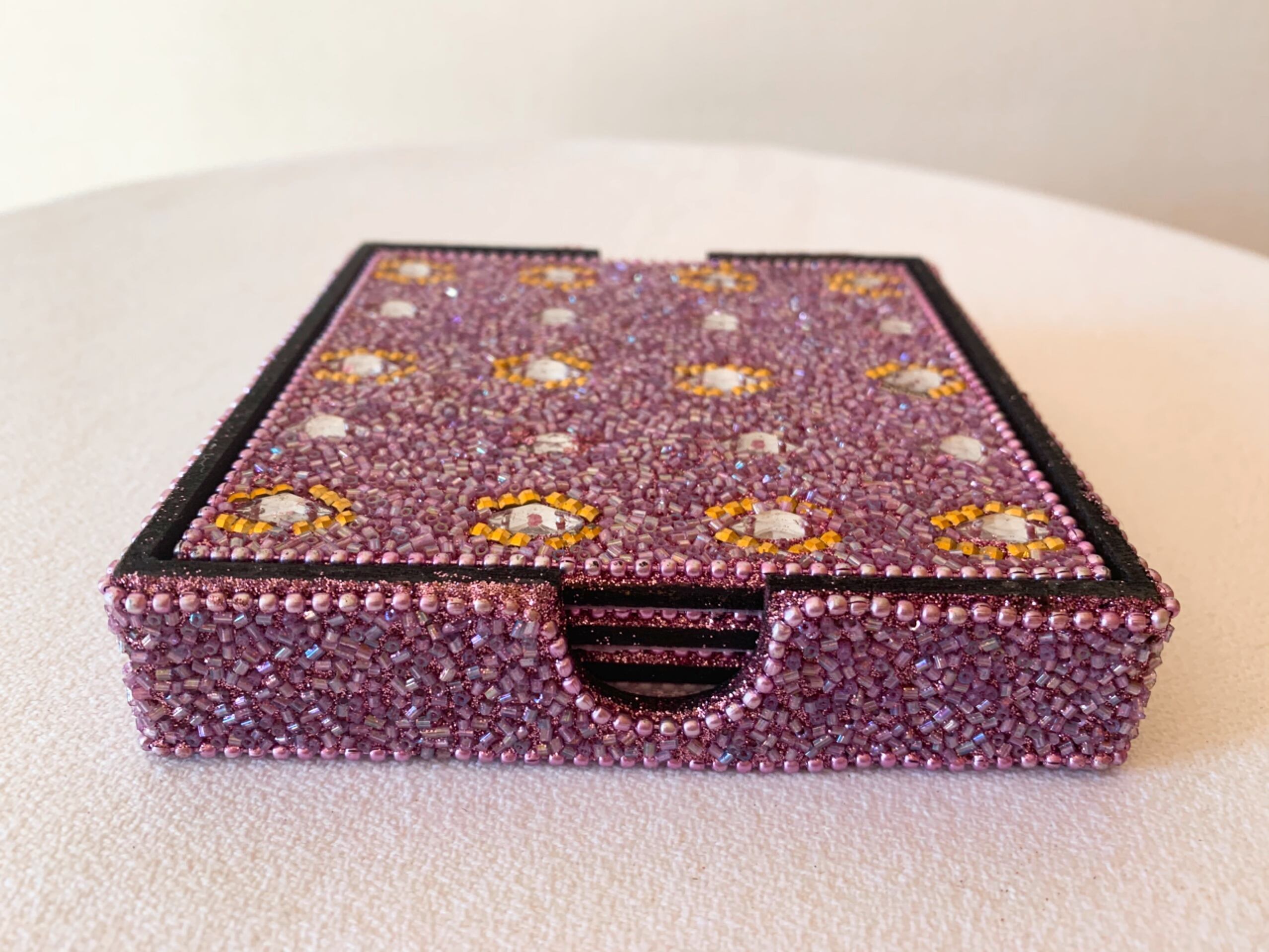 キラキラのビーズが散りばめられたコースターです。