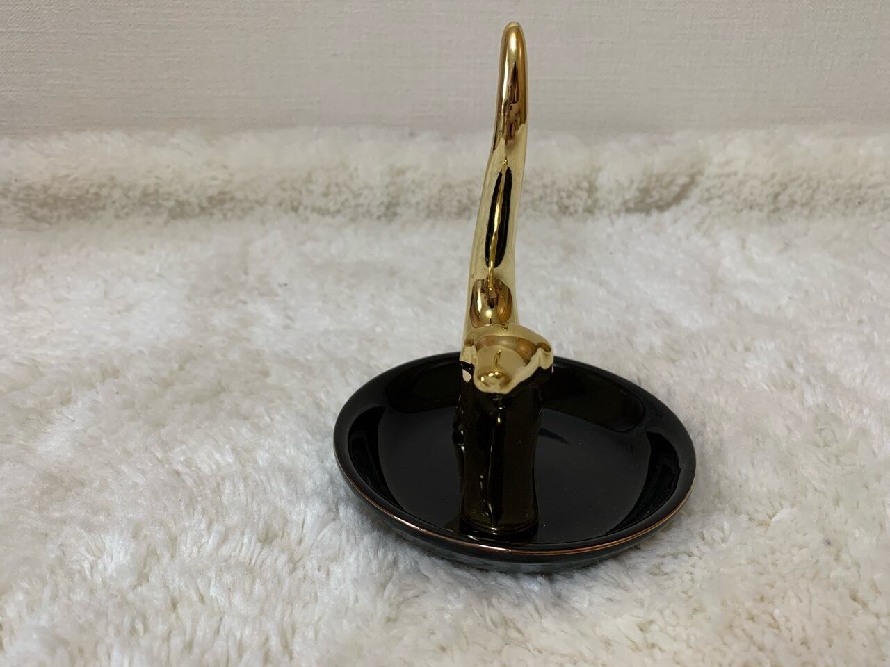 黒のお皿の上にゴールド色の犬をあしらったジュエリー置きです。